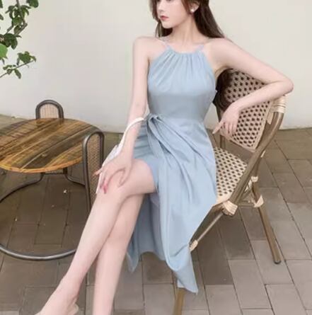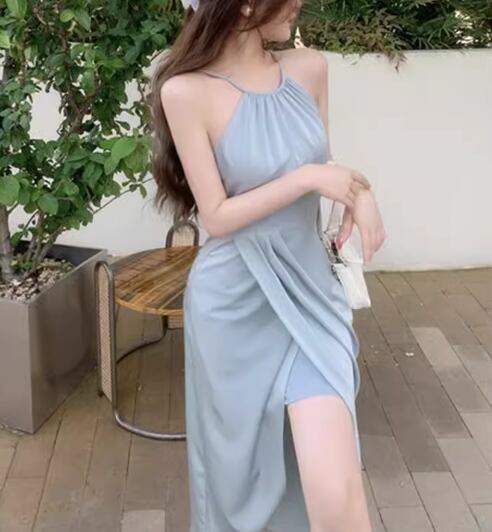 レディース ワンピース ドレス ロング 袖なし ノースリーブ ラウンドネック ホルターネック タイト スリム 細身 背中開き スリット ファスナー ハイウエスト 大人可愛い きれいめ シンプル 上品 おしゃれ かっこいい こなれ感 クール エレガント 抜け感 ラグジュアリー セクシー シック 高級感 スタイリッシュ 無地 夏 デート お出かけ パーティー イベント 普段使い S M L 小さめ ブルー