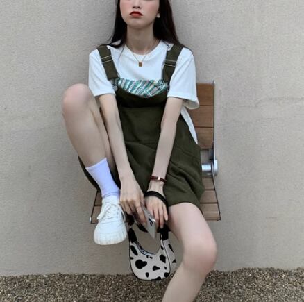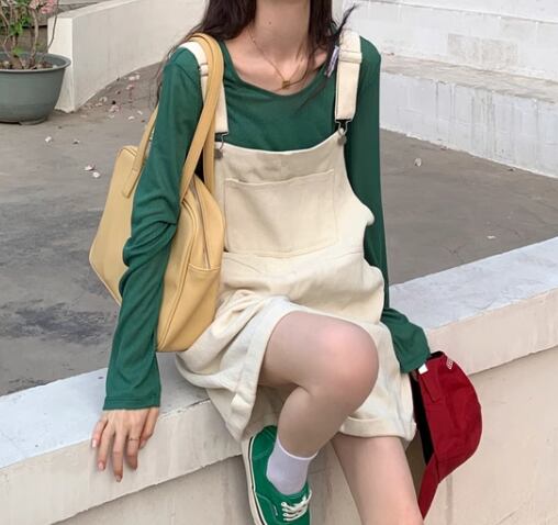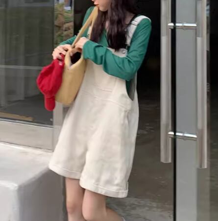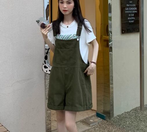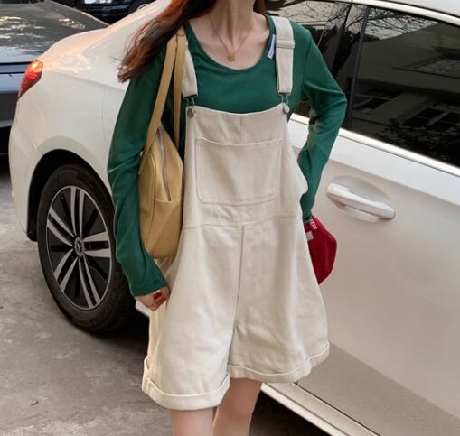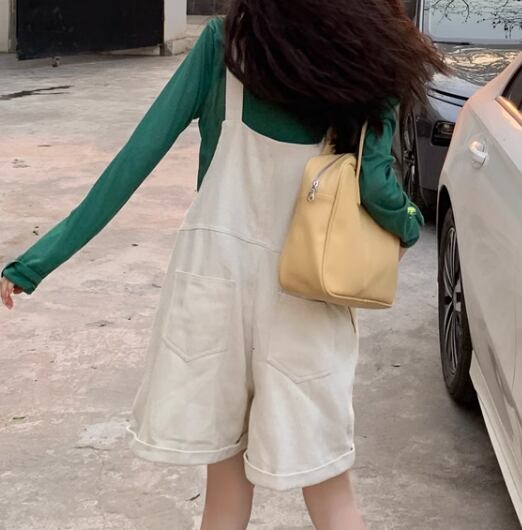 ゆったりシルエットが魅力的な、膝丈のオーバーオール。