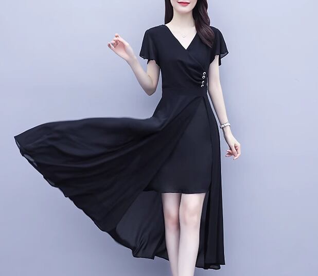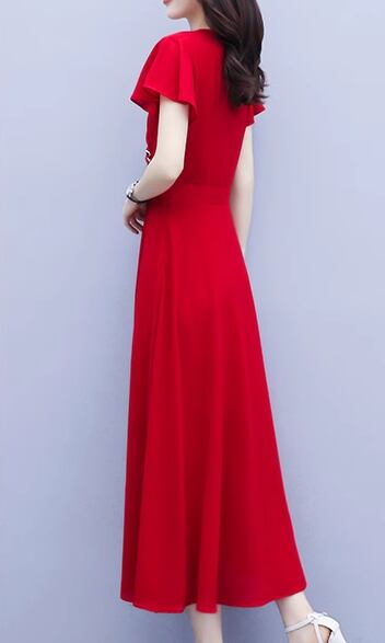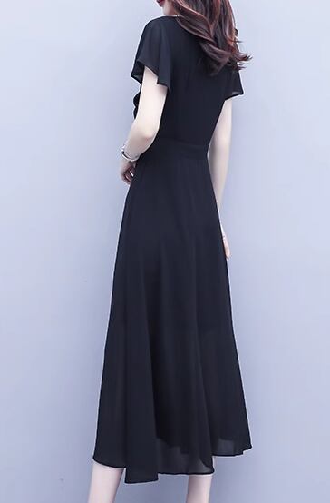 女性らしさを演出してくれる柔らかなシフォン生地とスタイリッシュなデザインが魅力的な半袖のロングドレス。