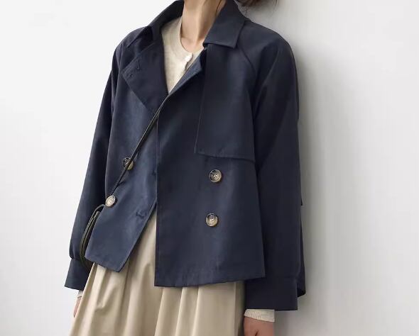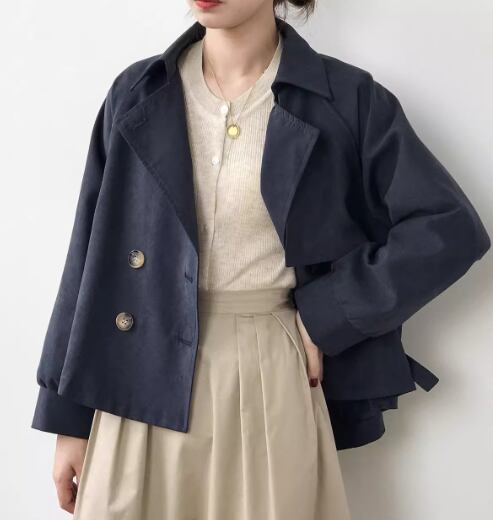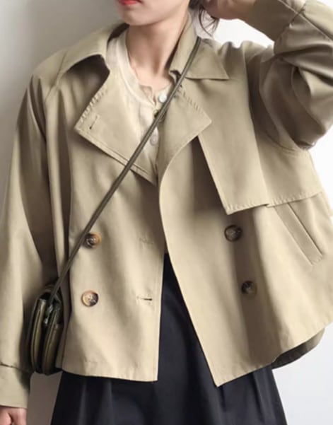 上品で落ち着いた色味と異国風のスタイリッシュなデザインが大人可愛い、ショート丈のトレンチコート。