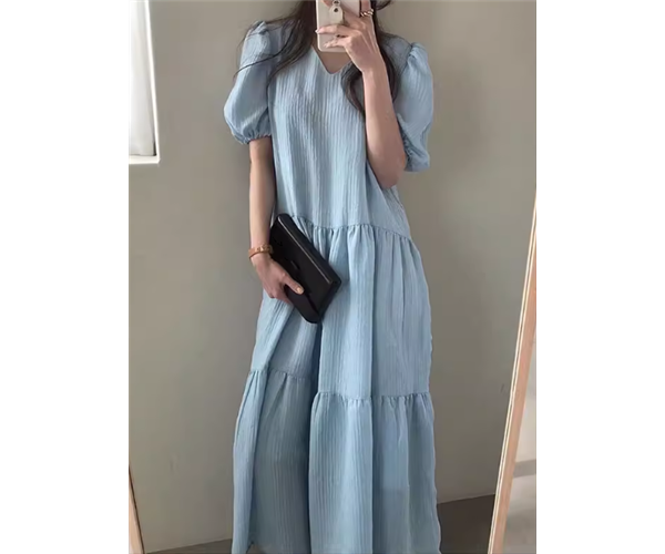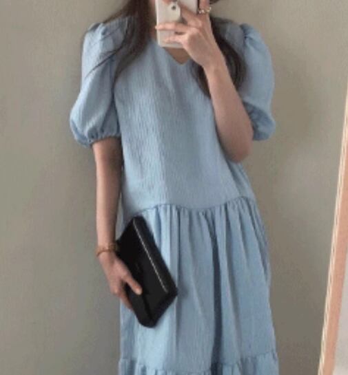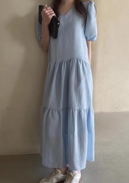 レディース ワンピース プルオーバー ロング マキシ 半袖 ボリューム袖 パフスリーブ Vネック ティアード フェミニン かわいい 大人可愛い きれいめ シンプル カジュアル 上品 おしゃれ レトロ ガーリー ルーズ キュート ナチュラル 爽やか リラックス シック 高級感 優しい 穏やか 涼しげ 柔らかい 無地 夏 デート お出かけ 楽ちん 体型カバー 普段使い 清楚 トレンド 流行 S M L XL ゆったり ブルー