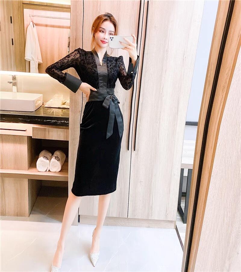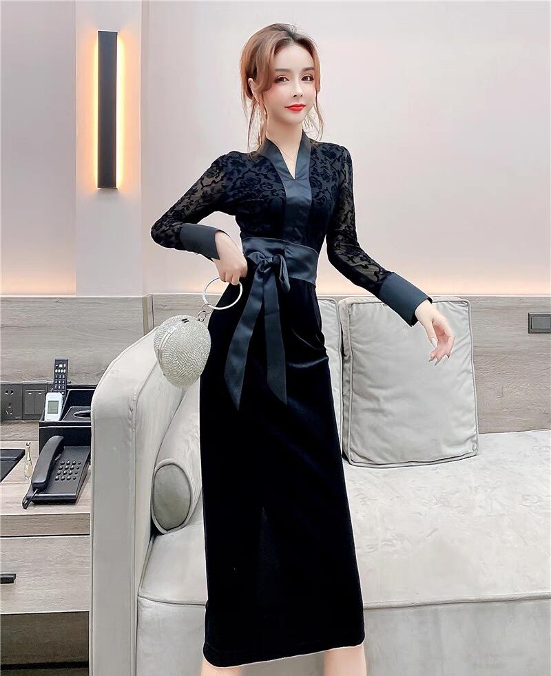 レディース ワンピース 膝下 長袖 Vネック タイト スリム 細身 アシンメトリー フェミニン ウエストマーク ウエストリボン ハイウエスト 透け感 シースルー 切り替えデザイン ドッキング 異素材ミックス ベルベット かわいい 大人可愛い おしゃれ かっこいい レトロ こなれ感 ガーリー エレガント モダン 存在感 抜け感 ラブリー キュート ラグジュアリー クラシカル ロマンティック 花柄 フラワー 秋 冬 冠婚葬祭 お出かけ パーティー イベント 休日 合コン コンパ S M L XL 黒 ブラック