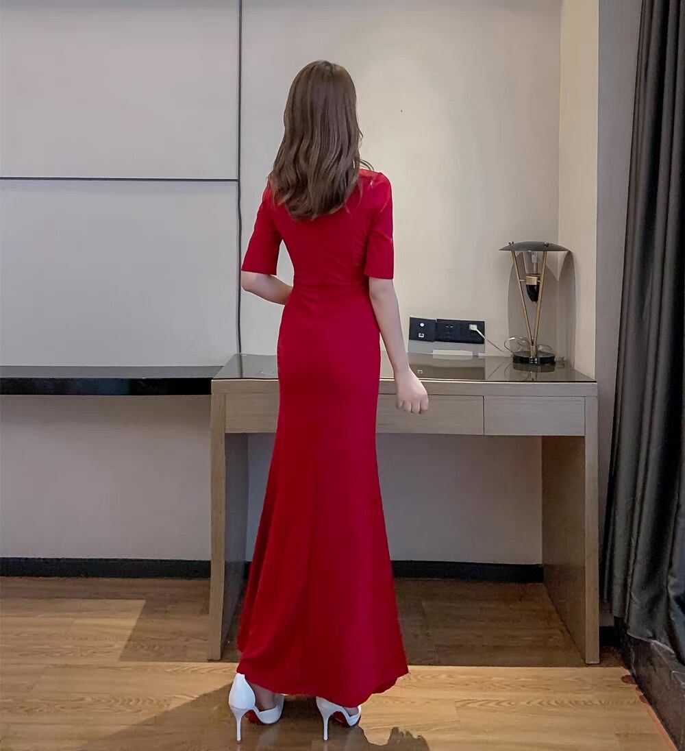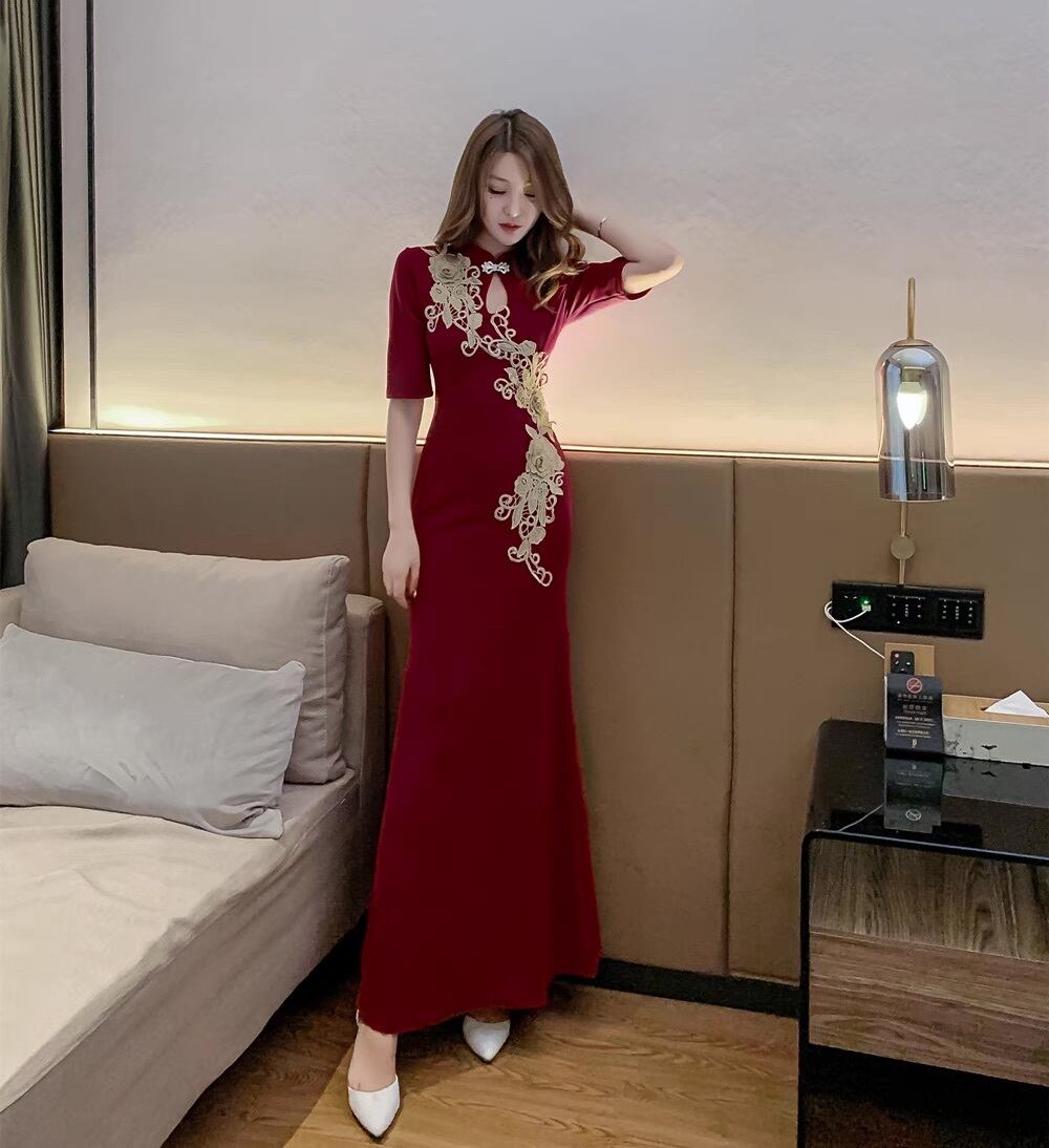 ドレス パーティー ステージ 舞台 衣装 マキシ 5分袖 スタンドカラー スレンダー タイト スリム イブニング チャイナドレス 刺繍 サイドスリット アシンメトリー 可愛い きれいめ 大人可愛い 上品 おしゃれ かっこいい レトロ アジアン エスニック エキゾチック キュート ガーリー エレガント モダン 主役級 存在感 クラシック 清楚 ゴージャス エレガント セクシー 華やか パーティー イベント 美脚 脚長 高見え 格上げ S M L XL スリム 黒 ワインレッド ゴールド ブラック レッド