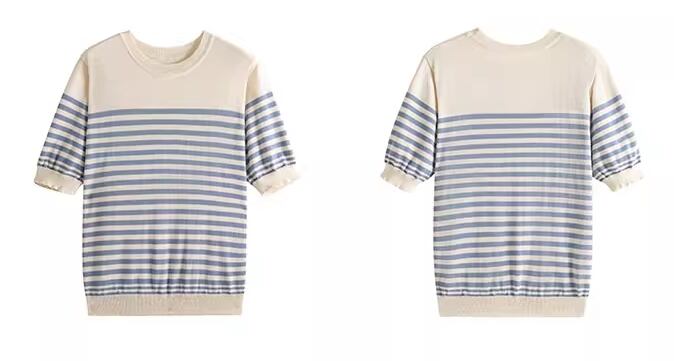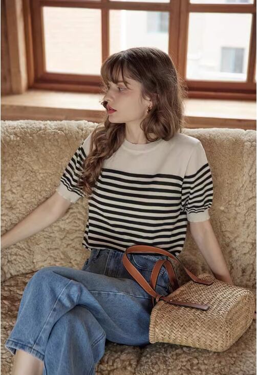 レディース トップス ニット プルオーバー サマーニット ボーダー パネルボーダー 半袖 ラウンドネック 襟なし ノーカラー ストレート フェミニン ニット かわいい 大人可愛い シンプル カジュアル おしゃれ こなれ感 ラフ ガーリー 主役級 存在感 抜け感 ナチュラル 春 夏 デート お出かけ 旅行 公園 女子会 休日 ショッピング カフェ 韓国 オルチャン コーデ 体型カバー 普段使い 着回し S M L XL ホワイト×ブラック ホワイト×ライトブルー