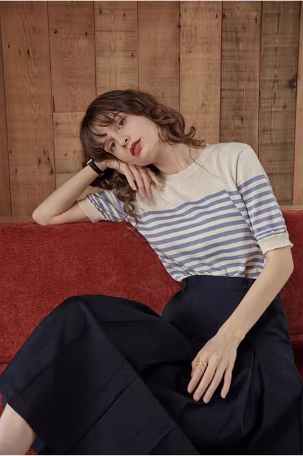 様々な着こなしにマッチするパネルボーダー半袖ニットトップス。