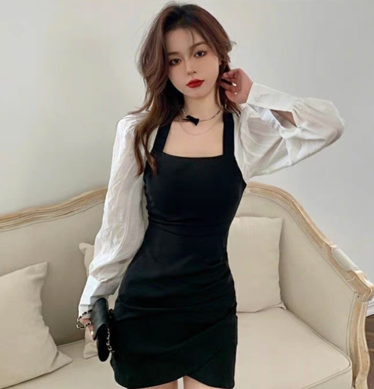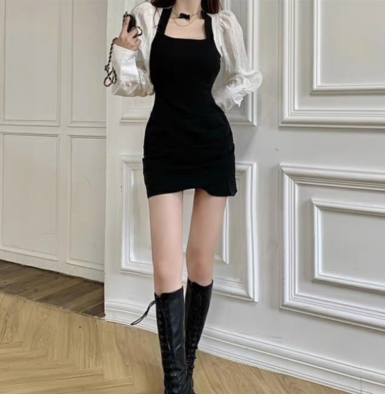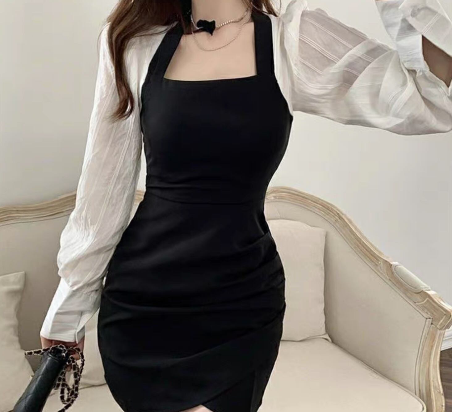 レディース ワンピース ショート 長袖 スクエアネック タイト スリム 細身 フェミニン 切り替えデザイン ドッキング かわいい 大人可愛い きれいめ シンプル 上品 おしゃれ こなれ感 ガーリー クール モード系 エレガント モダン 存在感 抜け感 ラブリー キュート ロマンティック 無地 春 秋 パーティー イベント 女子会 休日 合コン コンパ カフェ 美脚 脚長 普段使い 着回し レイヤード モテ 清楚 トレンド 流行 インスタ映え S M L 白 ホワイト 黒 ブラック バイカラー モノトーン