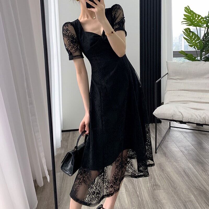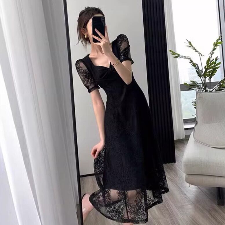 シアー切替え デコルテ見せ レディース ワンピース ドレス 膝下 ミモレ ミディアム丈 半袖 ボリューム袖 パフスリーブ 襟なし ペンタゴンネック ハートネック 鎖骨見せ Aライン レース 透け感 シースルー 切り替えデザイン かわいい 大人可愛い きれいめ シンプル おしゃれ エレガント セクシー 女っぽ 色っぽい シック 花柄 ボタニカル柄 植物柄 春 夏 女の子 デート パーティー イベント 韓国 オルチャン コーデ 脚長 モテ インスタ映え S M L XL 着痩せ 黒 ブラック モノトーン