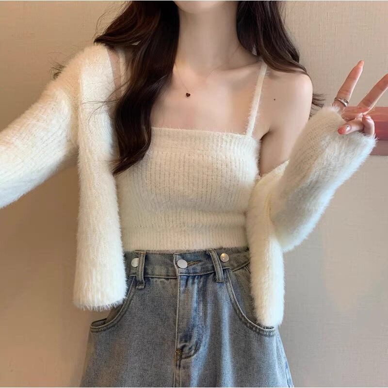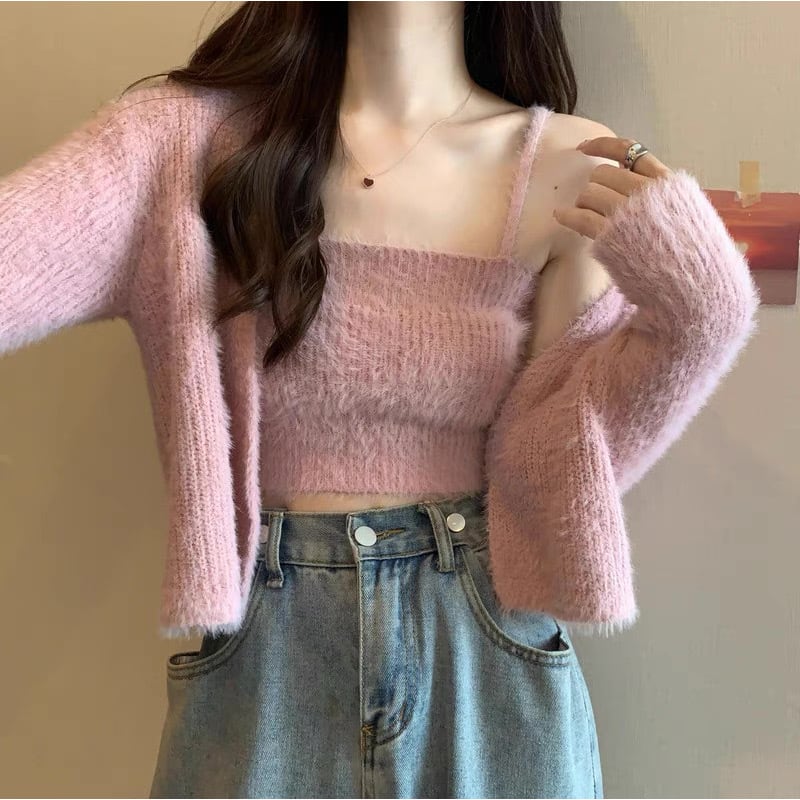 ふわふわとした素材感が女性らしい可愛さを引き立てる、カーディガンとキャミソールの2点セット。