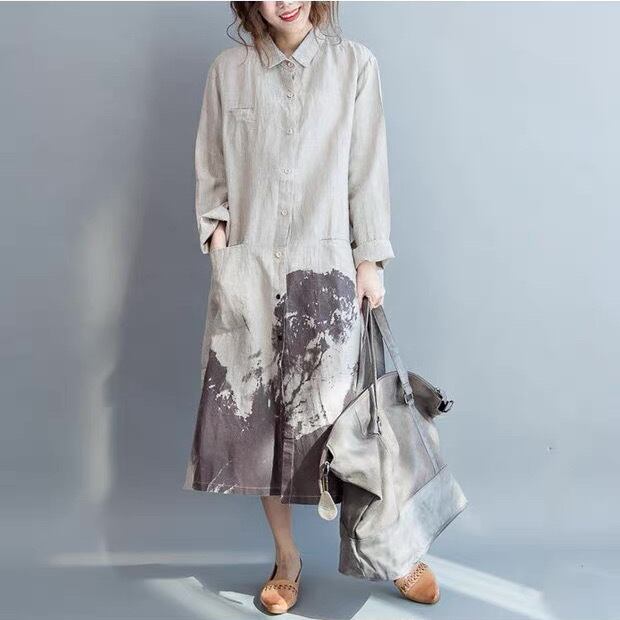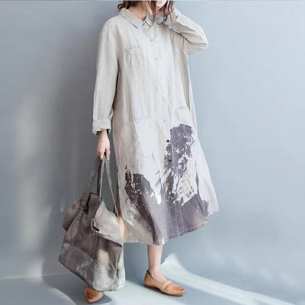 レディース ワンピース シャツ リネンシャツ シャツワンピ スリムスリットシャツ ミモレ ロング 長袖 ポロカラー ラペル ポケット 前開き ボタン スリット サイドスリット オシャレ 文学 レトロ かっこいい クール モード シンプル こなれ感 ラフ メンズライク ボーイッシュ プリント 水墨画 ペイント インク 春 秋 冬 デート お出かけ アウトドア 公園 女子会 休日 ショッピング 韓国 オルチャン コーデ 楽ちん 普段使い 着回し スタイル デイリー フリーサイズ ゆる 白 ホワイト ベージュ