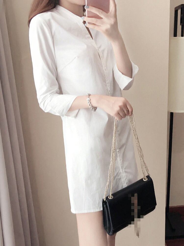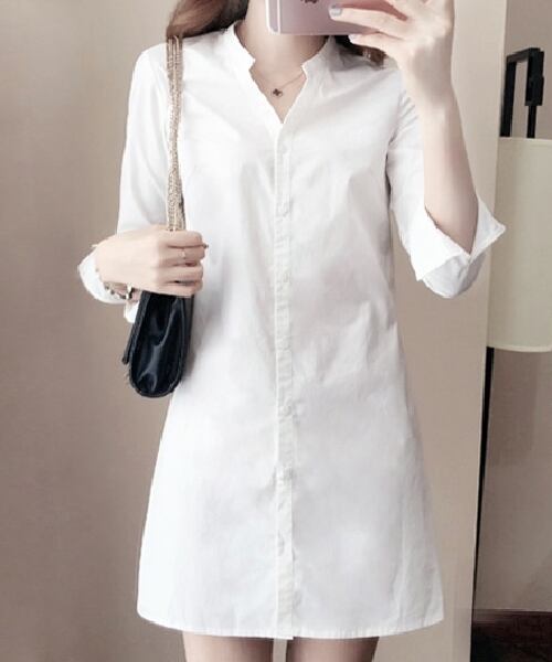 レディース ワンピース シャツワンピ 前開き ショート 長袖 Vネック スリム 細身 フィット 大人可愛い シンプル こなれ感 ラフ 爽やか セクシー 無地 オールシーズン デート お出かけ 海 女子会 休日 合コン 楽ちん 美脚 脚長 モテ S M L XL 2XL ホワイト