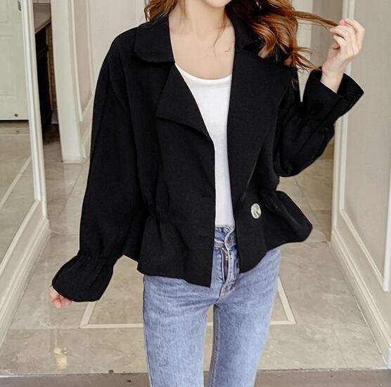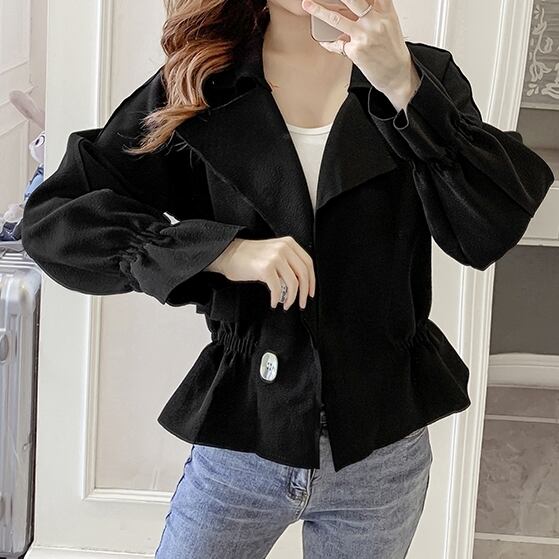 レディース ジャケット 上着 前開き ミドル丈 長袖 萌袖 フリル袖 Vネック 襟付き スーツカラー フェミニン プリーツ ボタン かわいい 大人可愛い カジュアル ガーリー 個性的 主役級 存在感 キュート 無地 デート お出かけ 女子会 暖かい 防寒 普段使い S M L XL 2XL ブラック ベージュ アーミーグリーン