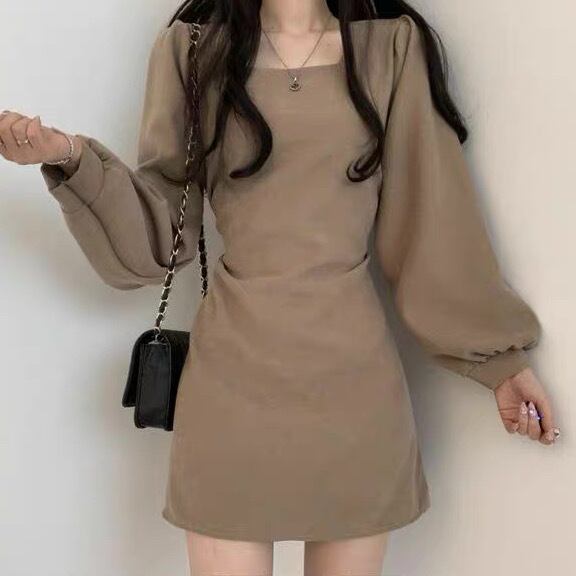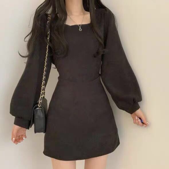 レディース ワンピース プルオーバー ミニ ショート 長袖 パフスリーブ スクエアネック Aライン フェミニン リボン ウエストリボン ファスナー ハイウエスト かわいい 大人可愛い きれいめ シンプル 上品 おしゃれ ガーリー クール キュート クラシカル ベーシック 無地 秋 冬 デート お出かけ レストラン 女子会 休日 ホテル ショッピング 合コン コンパ カフェ 韓国 オルチャン コーデ 美脚 脚長 普段使い 着回し モテ スタイル デイリー サイズ S M L XL 色 黒 ブラック カーキ