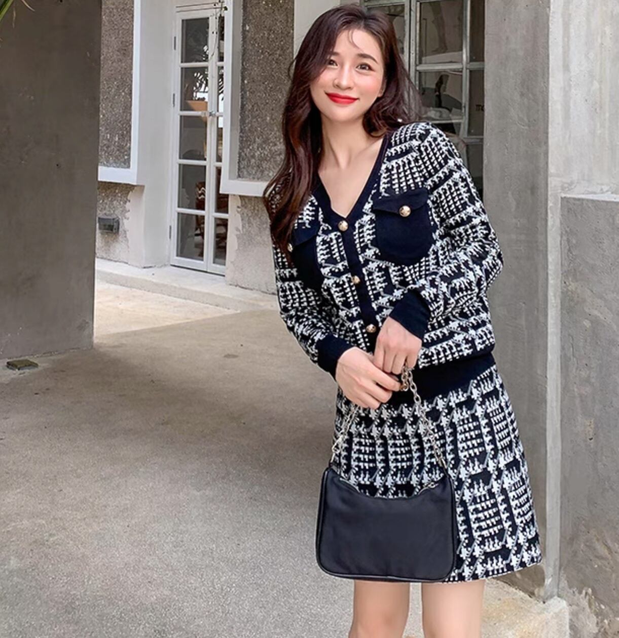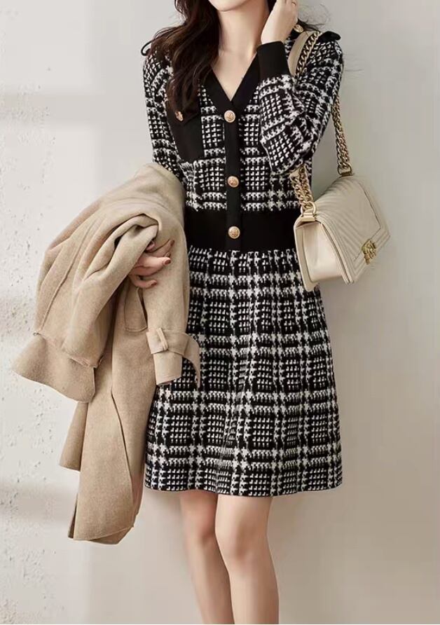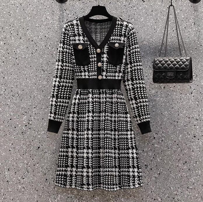レディース ワンピース ニットワンピ 膝丈 長袖 Vネック フレア Aライン ウエストマーク ハイウエスト コンサバ ボタン かわいい 大人可愛い きれいめ 上品 レトロ ガーリー エレガント モダン 抜け感 ラブリー キュート クラシカル ベーシック ロマンティック ナチュラル チェック 格子柄 秋 冬 入学式 入園式 卒業式 卒園式 デート お出かけ イベント 休日 ショッピング 発表会 普段使い 着回し M L XL 2XL 3XL 小さいサイズ 大きいサイズ ビッグ ゆったり ゆる 黒 ブラック