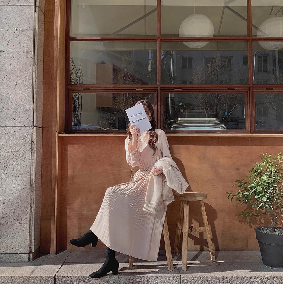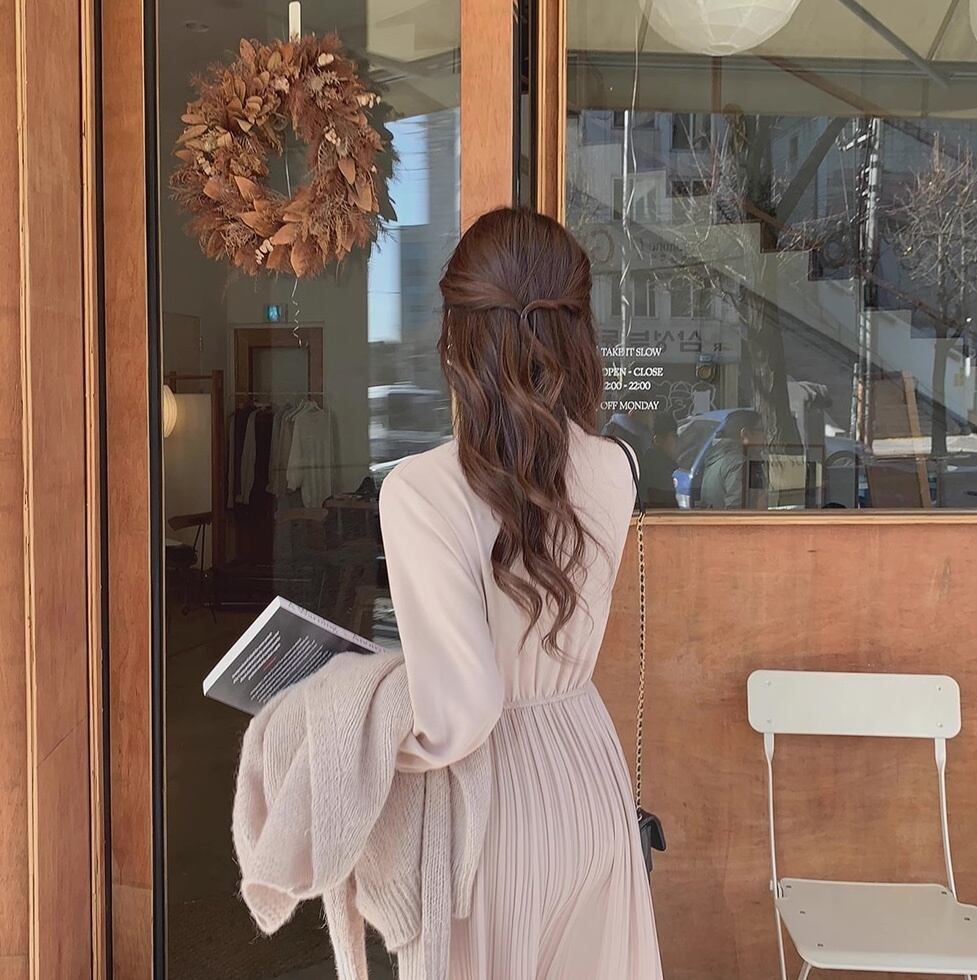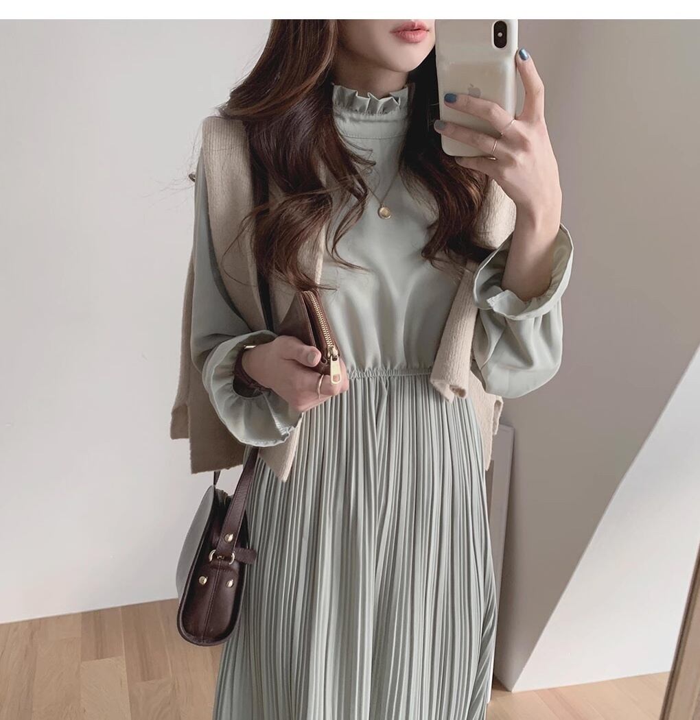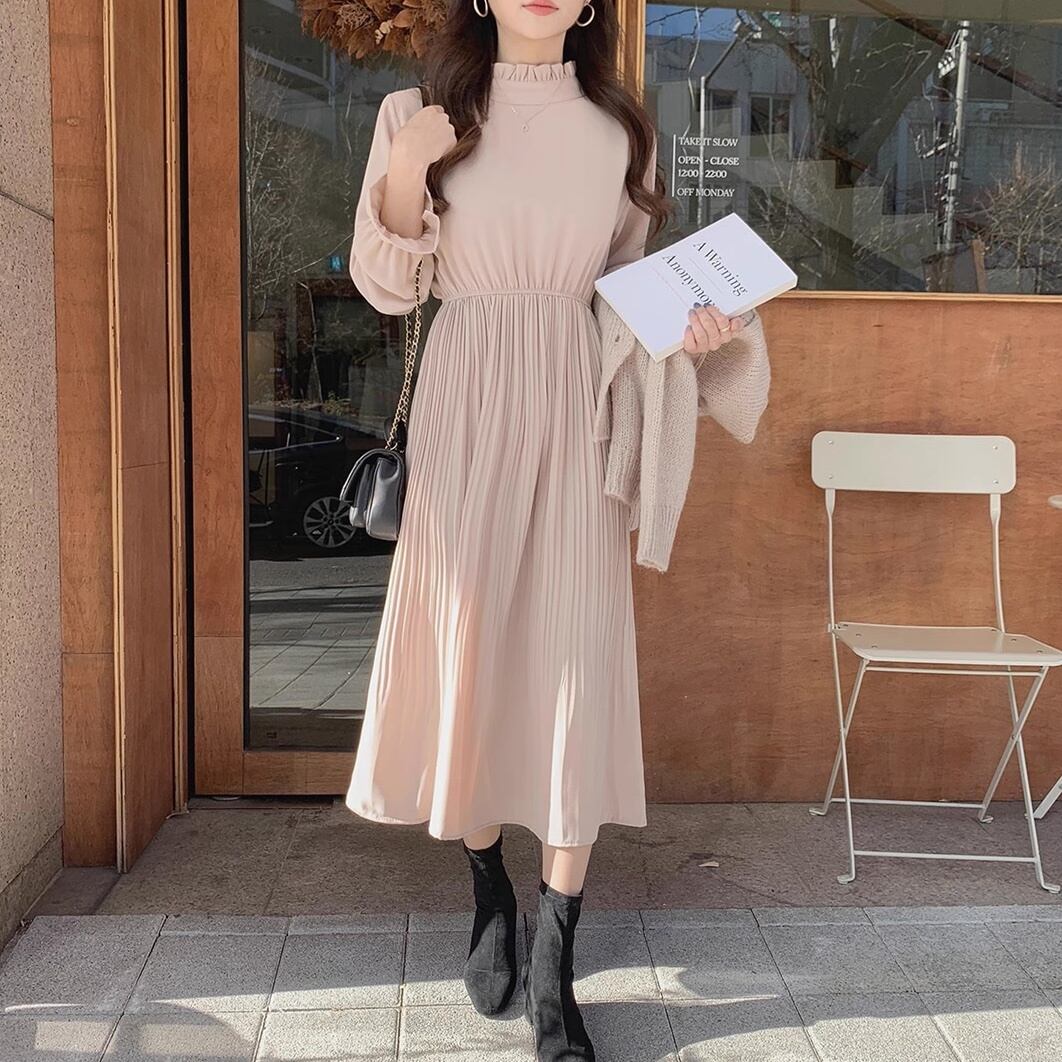 レディース ワンピース ミモレ 長袖 ボリューム袖 フリルカラー フレア Aライン フェミニン プリーツ フリル ウエストマーク かわいい 大人可愛い シンプル カジュアル おしゃれ レトロ こなれ感 ガーリー ラブリー キュート ベーシック ロマンティック ナチュラル 無地 春 秋 デート お出かけ 女子会 休日 コンパ カフェ お揃い 双子 体型カバー 普段使い 着回し レイヤード モテ 清楚 トレンド 流行 インスタ映え S M L XL 小さいサイズ 大きいサイズ ピンク くすみ 緑 グリーン