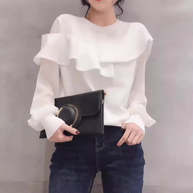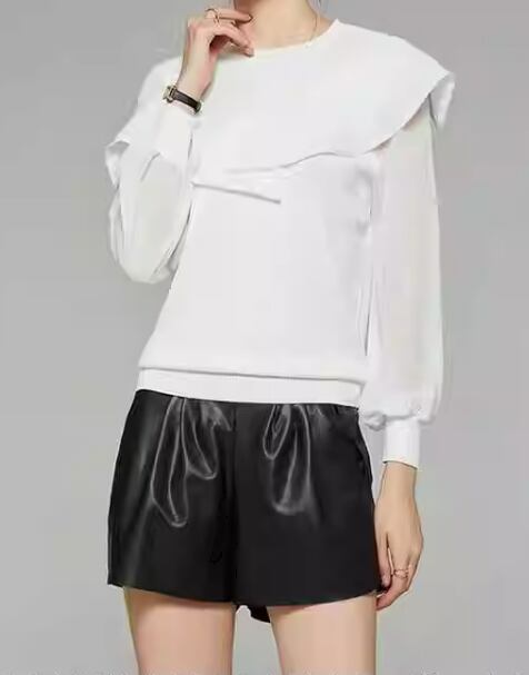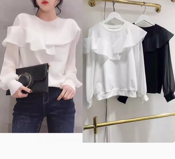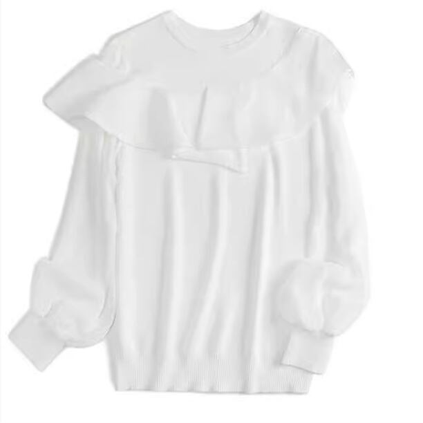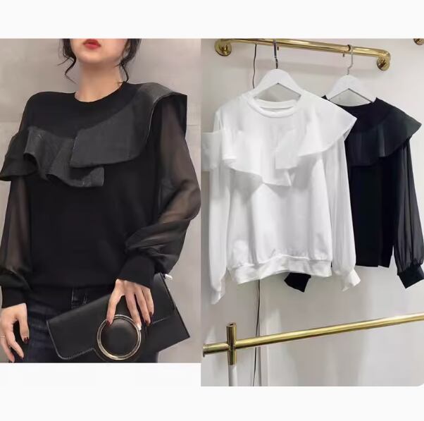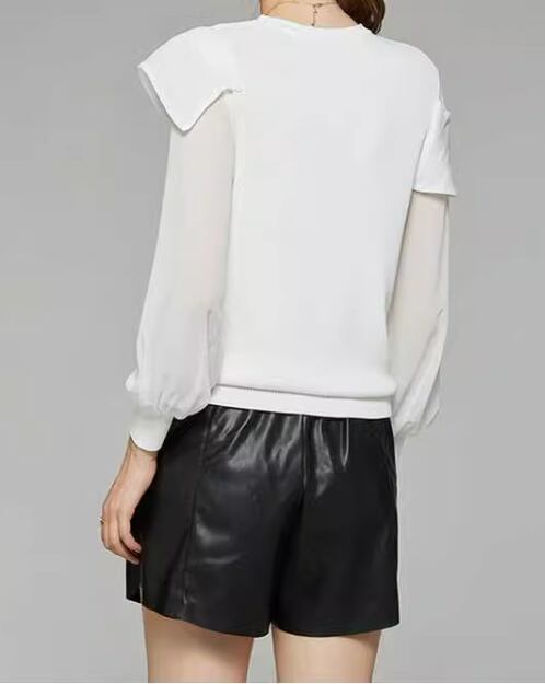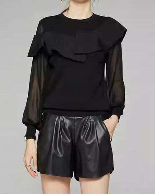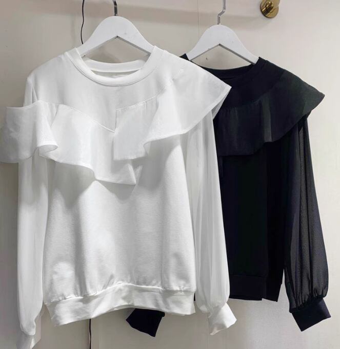 フェミニンで上品なシフォンフリルが可愛い、大人女性におすすめのプルオーバーシャツ。