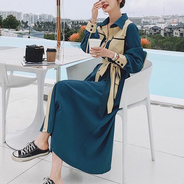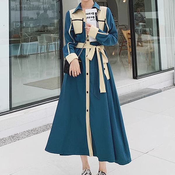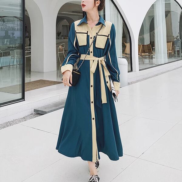 フランスレトロな成熟スタイルのシャツドレス レディース ワンピース ドレス フレア フレアスカート ロングスカート ロング 長袖 Vネック ポロカラー フレア Aライン フォーマル フェミニン ベルト ハイウエスト 前開き ボタン バイカラー 大人可愛い きれいめ 上品 おしゃれ エレガント フォーマル 無地 春 秋 20代 30代 ビジネス お出かけ パーティー レストラン ショッピング 韓国
