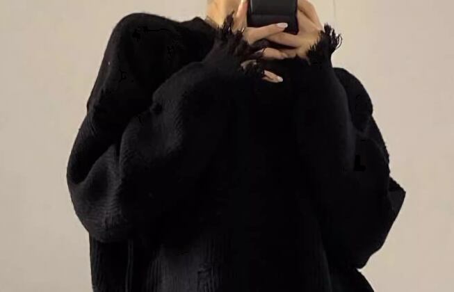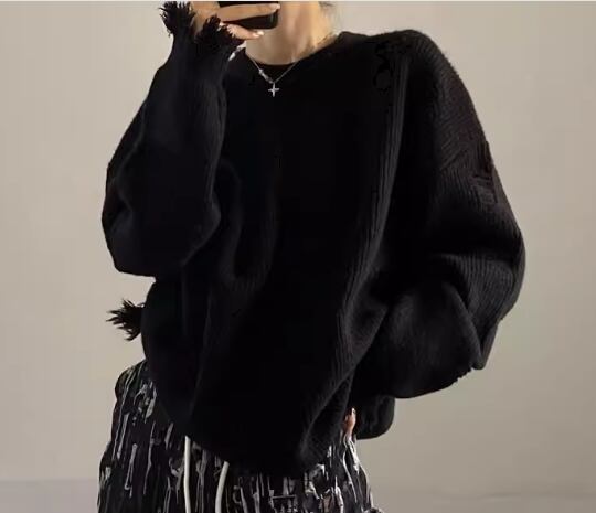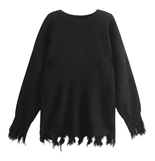 クールなブラック×ダメージ加工がかっこいい、ミドル丈の長袖セーター。