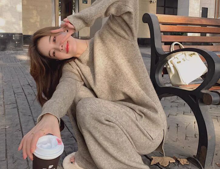 シックなカラーが大人可愛い、ニット素材のセットアップ。