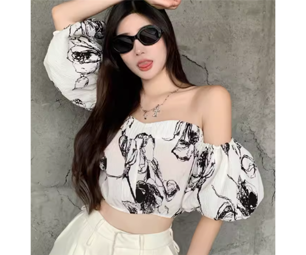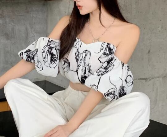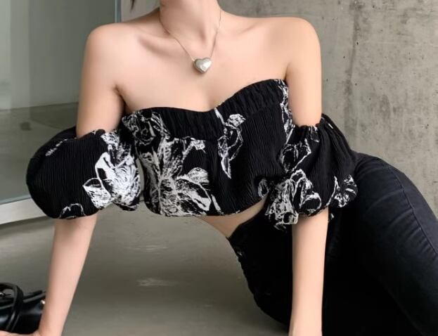 オフショル風のデザインと短めの丈感でセクシーな印象にしてくれるアイテムです。