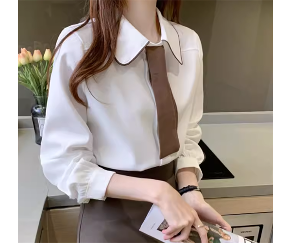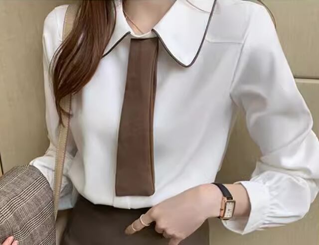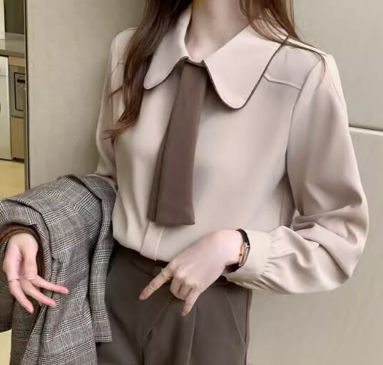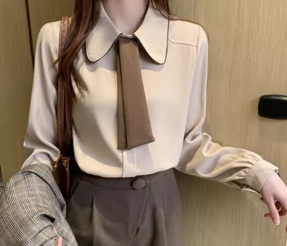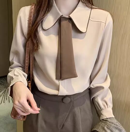 シックなカラーの2色使いが大人可愛い、長袖のボウタイシャツ。