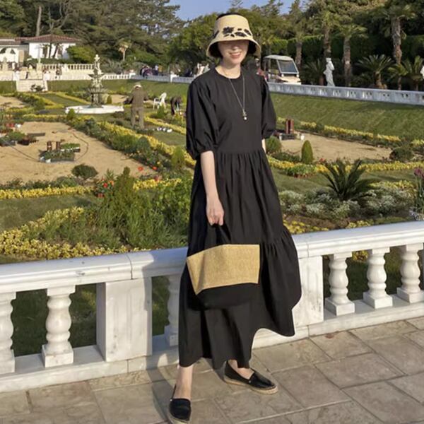 レディース ワンピース ドレス ロング パフスリーブ ラウンドネック ワイド フレア Aライン プリーツステッチ ギャザー 綿 大人可愛い シンプル 上品 エレガント 清潔感 オフィスカジュアル お洒落 優しい 涼しげ ゆったり こなれ感 無地 春 夏 秋 韓国 着回し 普段使い 10代 20代 30代 オフィス 通勤 レストラン ショッピング カフェ コーデ