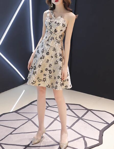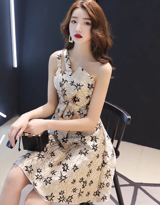 レディース ワンピース ドレス パーティードレス 袖なし ワンショルダー 刺繍 かわいい 大人可愛い 上品 おしゃれ 主役級 存在感 豪華 派手 セレブリティ セクシー ファンシー メルヘン 星柄 オールシーズン 二次会 披露宴 パーティー イベント ホテル XS S M L XL 2XL シャンパン