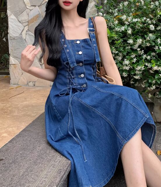 レディース スカート オールインワン 袖なし ノースリーブ タイト スリム 細身 ストレート ボタン デニム ブルーデニム かわいい 大人可愛い シンプル カジュアル ガーリー ラブリー キュート ナチュラル ポップ 無地 夏 10代 20代 デート 公園 女子会 休日 韓国 オルチャン コーデ 普段使い 着回し モテ 清楚 トレンド 流行 定番 フリーサイズ ブルー