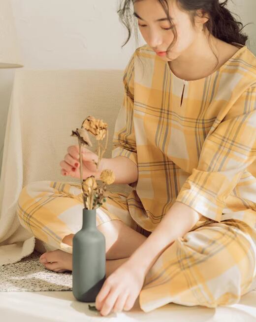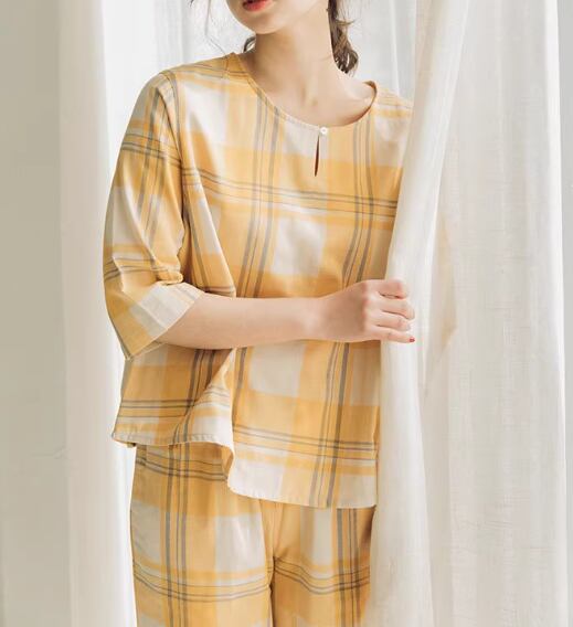 柔らかな肌触りが心地よいチェック柄のパジャマセット。上下の組み合わせは、カジュアルにもリラックスウェアとしても使える優れもの。鮮やかな黄色が明るい気分にしてくれること間違いなしです。
