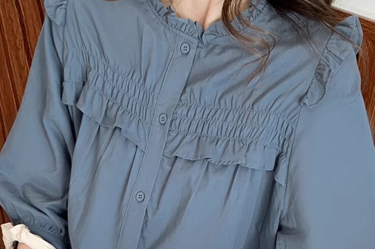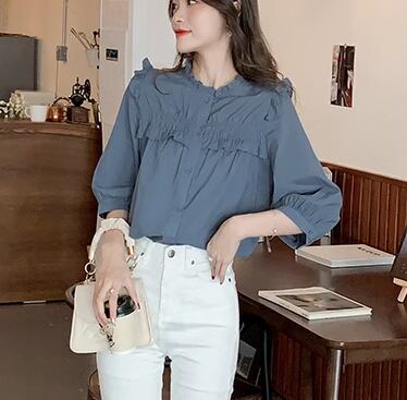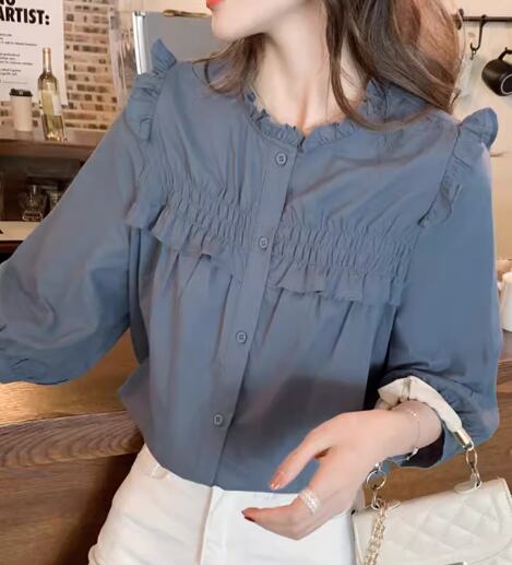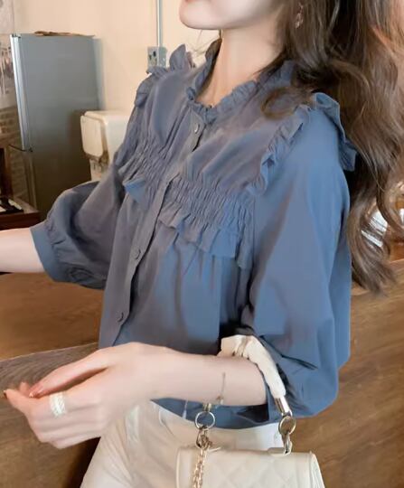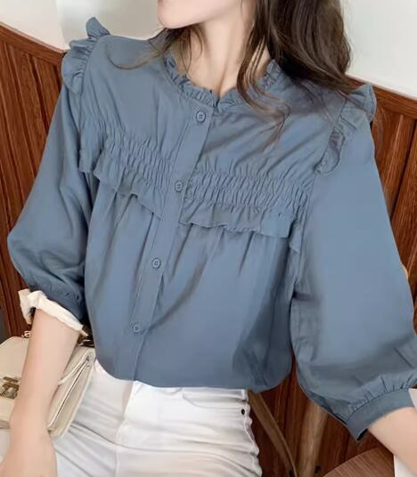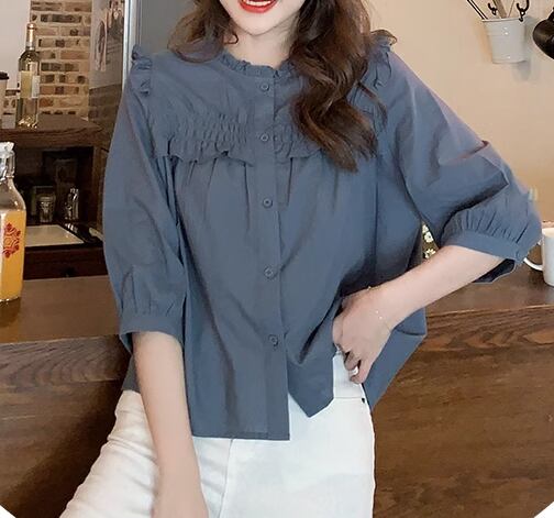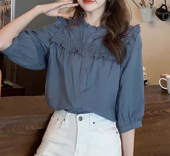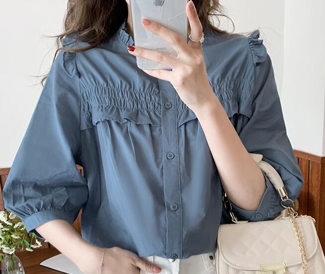 レディース トップス シャツ ミドル丈 半袖 5分袖 ボリューム袖 ランタンスリーブ ストレート シャーリング フリル ボタン かわいい 大人可愛い きれいめ シンプル カジュアル 上品 おしゃれ レトロ ガーリー ルーズ エレガント キュート クラシカル 清潔感 シック 高級感 無地 春 夏 オフィス ビジネス OL 通勤 デート お出かけ 体型カバー 普段使い 着回し 清楚 S M L XL ゆったり ブルー