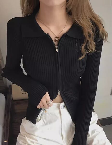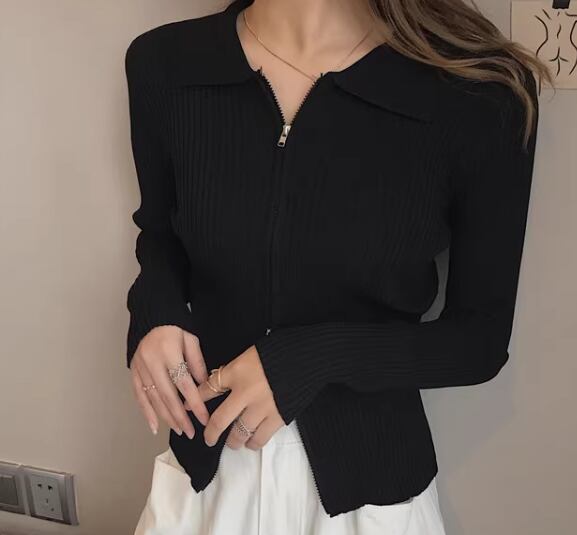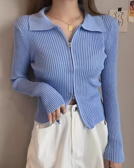 レディース トップス ニット セーター ショート 長袖 襟付き ポロカラー タイト スリム 細身 スマート ファスナー 前開き 大人可愛い きれいめ シンプル カジュアル 上品 おしゃれ かっこいい こなれ感 ボーイッシュ クール ラグジュアリー ナチュラル セクシー ハンサム シック 高級感 スタイリッシュ 無地 春 秋 冬 デート お出かけ 普段使い 着回し フリーサイズ 小さめ フィット ホワイト ブラック ブルー