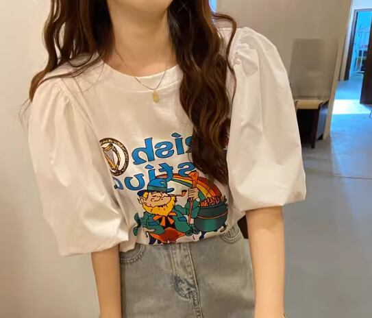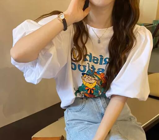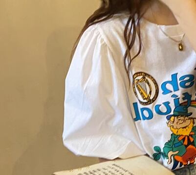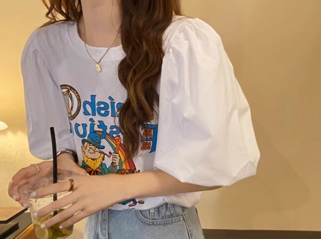 レディース トップス カットソー プルオーバー Tシャツ ミドル丈 半袖 ボリューム袖 パフスリーブ ラウンドネック かわいい カジュアル おしゃれ レトロ ラフ ボーイッシュ ルーズ 個性的 クール 存在感 キュート ラグジュアリー 清潔感 リラックス スタイリッシュ プリント 夏 10代 20代 学生 デート お出かけ 体型カバー 普段使い 着回し トレンド 流行 M L XL ゆったり ホワイト