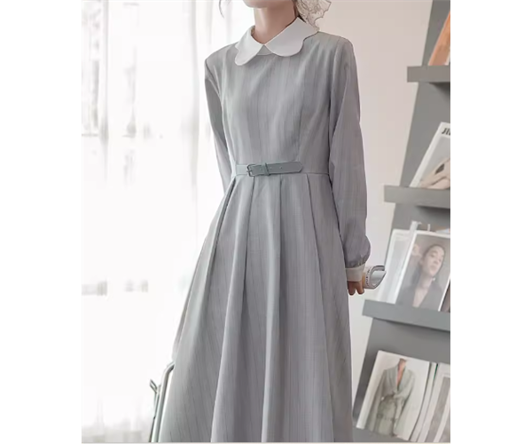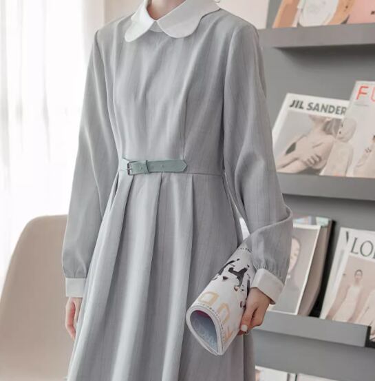 上品な色味とクラシカルなデザインが魅力的な長袖のロング丈ワンピース。