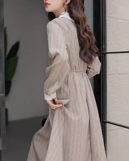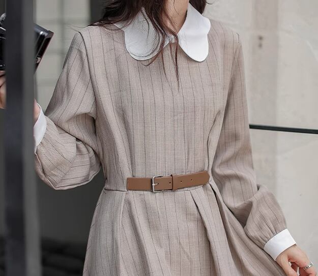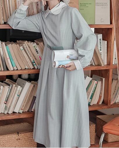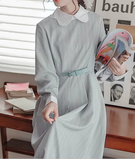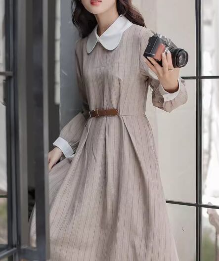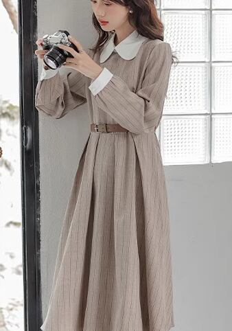 レディース ワンピース プルオーバー ドレス ミモレ ロング 長袖 襟付き Aライン ベルト ウエストマーク ハイウエスト ウエストゴム ボタン ストレッチ 伸縮性 かわいい きれいめ カジュアル 上品 おしゃれ レトロ エレガント ラブリー キュート クラシカル ナチュラル シック 高級感 優しい 穏やか ストライプ 秋 10代 20代 学生 デート お出かけ 体型カバー 普段使い 清楚 S M L ゆったり ブラウン ブルー