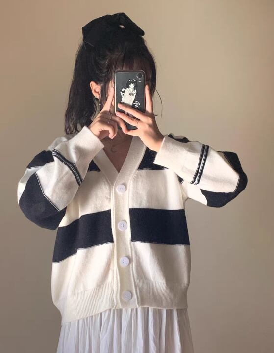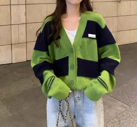 レディース トップス ニット セーター 羽織 長袖 前開き ボタン バイカラー 配色 かわいい 大人可愛い シンプル カジュアル おしゃれ かっこいい こなれ感 ラブリー キュート ポップ ボーダー 秋 冬 学生 学校 デート お出かけ 女子会 休日 韓国 オルチャン 白 黒 緑 グリーン