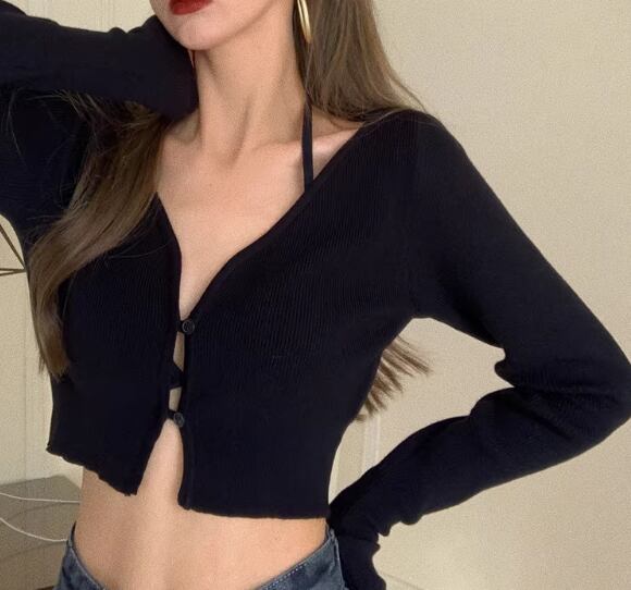 レディース トップス 羽織 長袖 Vネック タイト スリム 細身 リブ 前開き 異国風 コンサバ ボタン 肌見せ 伸縮性 かわいい 大人可愛い きれいめ シンプル カジュアル 上品 おしゃれ かっこいい こなれ感 無地 夏 デート お出かけ リゾート 旅行 韓国 オルチャン コーデ 美脚 脚長 着回し トレンド 流行 フィット