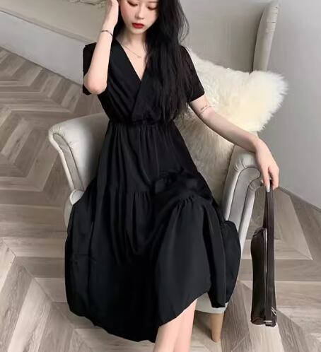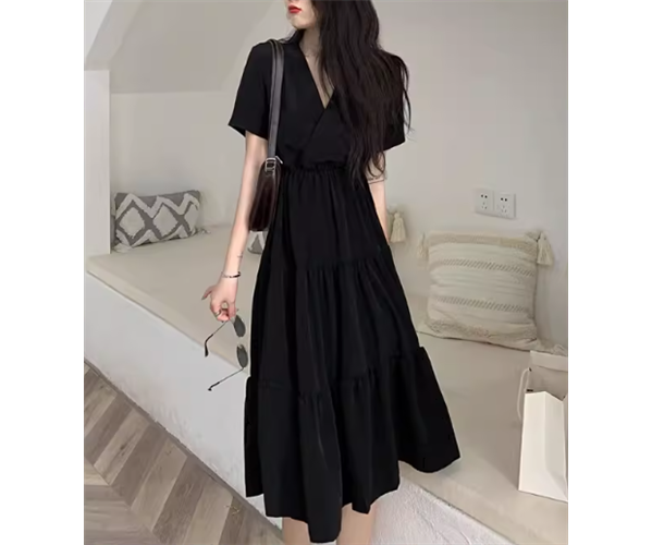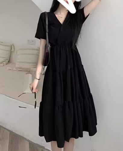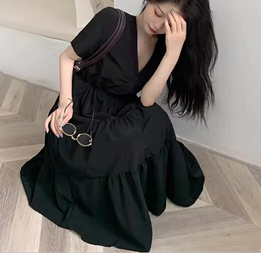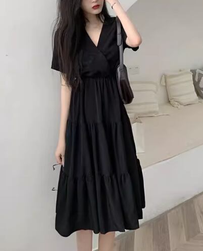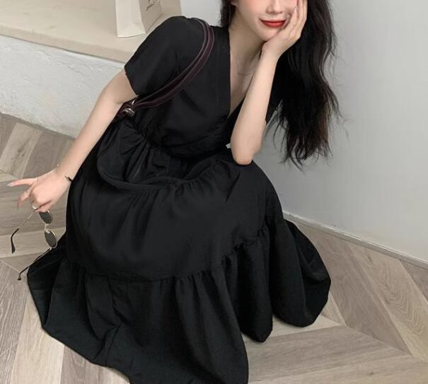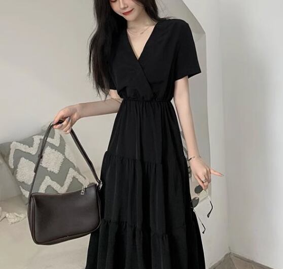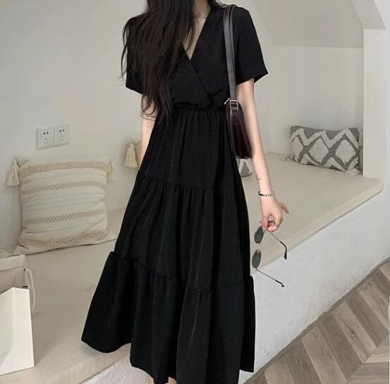 レディース ワンピース プルオーバー ドレス プリンセススカート ミモレ ロング 半袖 Vネック カシュクール Aライン ティアード ハイウエスト 大人可愛い きれいめ シンプル カジュアル 上品 おしゃれ レトロ ラフ ガーリー クール エレガント ナチュラル シック 無地 夏 デート お出かけ パーティー イベント 普段使い 清楚 L XL 大きいサイズ ブラック