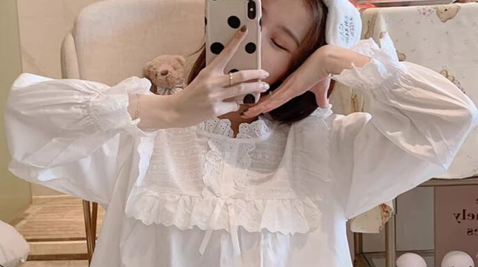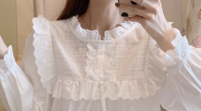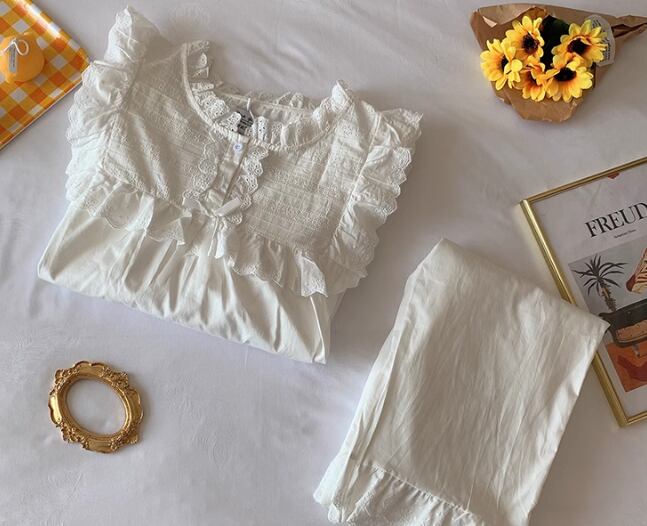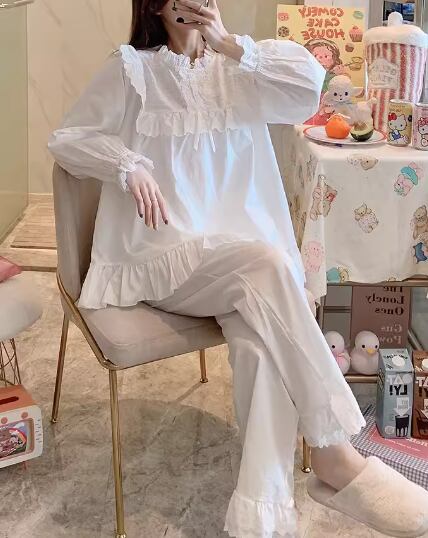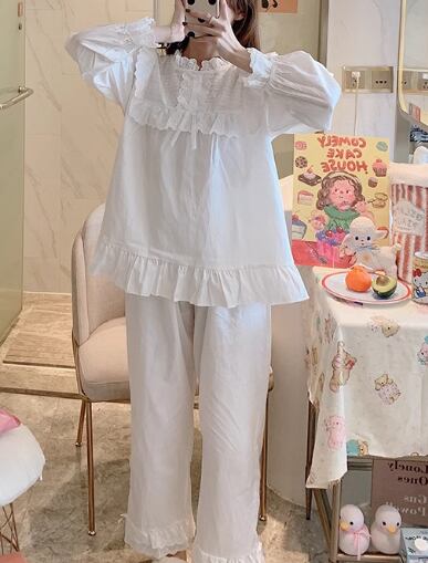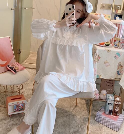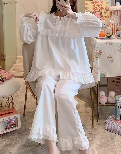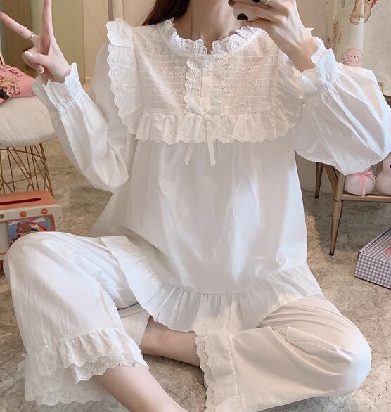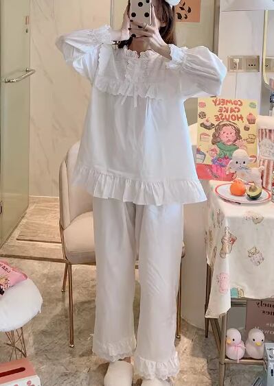 二点セット 上下セット ツーピース レディース パジャマ プルオーバー フルレングス 長袖 ラウンドネック フェミニン レース フリル リボン ウエストゴム 綿 コットン かわいい 上品 おしゃれ レトロ ガーリー 存在感 ラブリー キュート ロリータ ラグジュアリー メルヘン リラックス 華やか 優しい 穏やか フェアリー 無地 春 秋 10代 20代 学生 お泊まり 普段使い 清楚 S M L XL ゆったり ホワイト