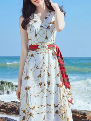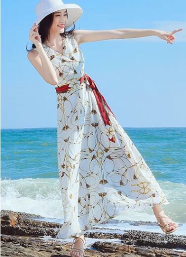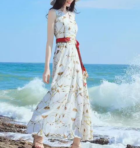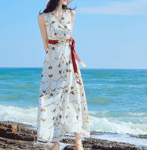 レディース ワンピース プルオーバー ロング マキシ 袖なし ノースリーブ Vネック フレア Aライン フェミニン シフォン ウエストマーク バックリボン ハイウエスト 異国風 大人可愛い きれいめ カジュアル 上品 おしゃれ レトロ ラフ ガーリー 個性的 エレガント 存在感 ラグジュアリー 清潔感 爽やか シック 高級感 芸術的 アーティスティック 華やか 優しい 穏やか 涼しげ プリント 夏 デート お出かけ 普段使い 清楚 S M L XL ブルー