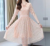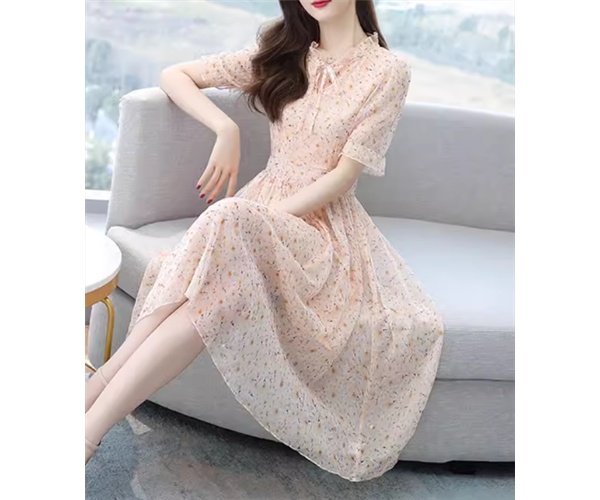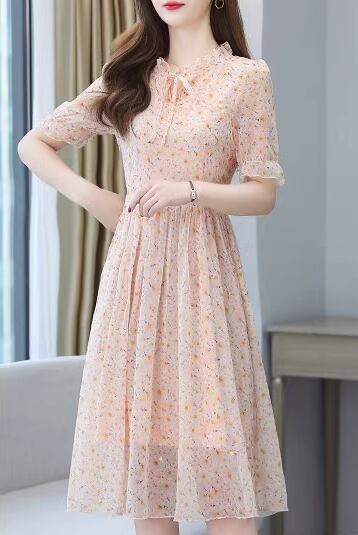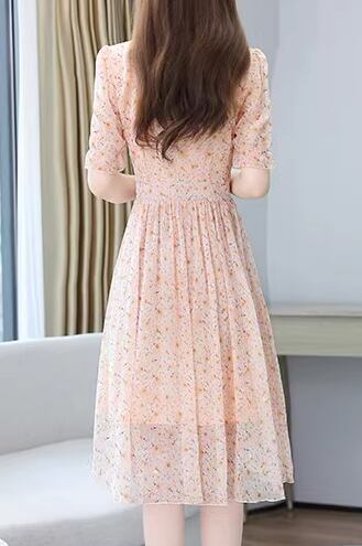 女性らしくて優しげなオレンジ色の小花柄プリントが可愛らしい、半袖のAラインワンピース。