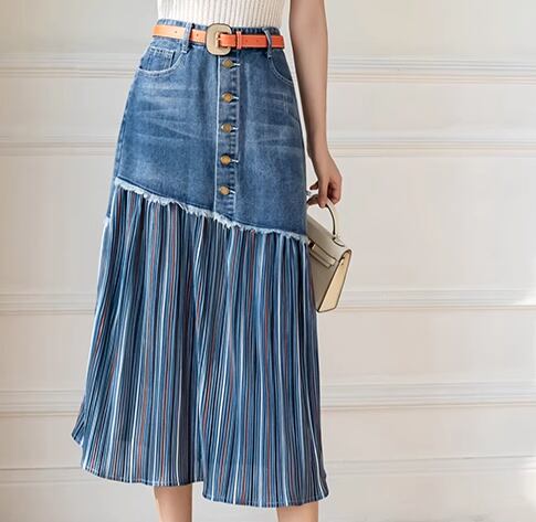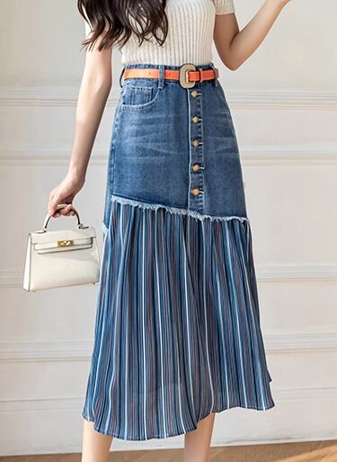 レディース スカート デニム 膝丈 ミモレ ミドル丈 Aライン プリーツ シフォン ハイウエスト ボタン 切り替えデザイン ドッキング かわいい 大人可愛い カジュアル おしゃれ ガーリー 個性的 存在感 キュート ラグジュアリー 爽やか シック 高級感 芸術的 アーティスティック 華やか スタイリッシュ 優しい 穏やか 春 秋 デート お出かけ 普段使い 着回し S M L XL ブルー
