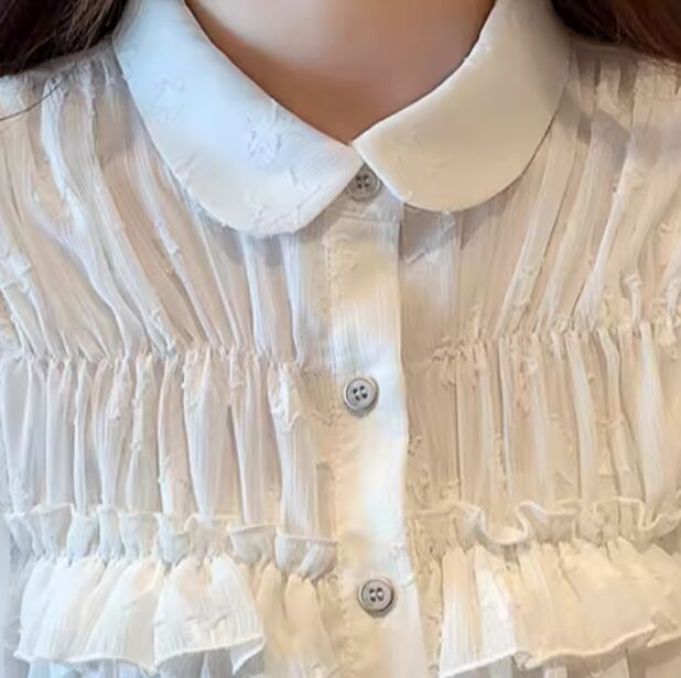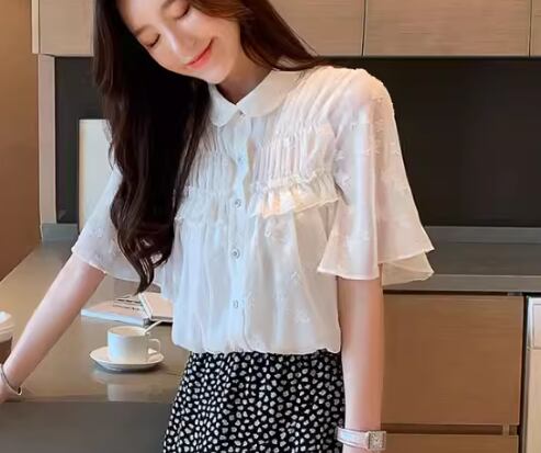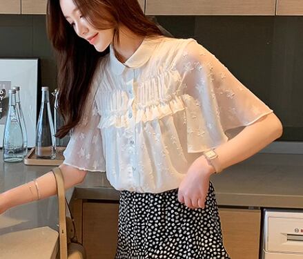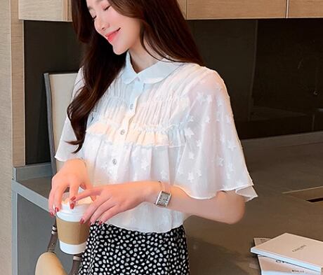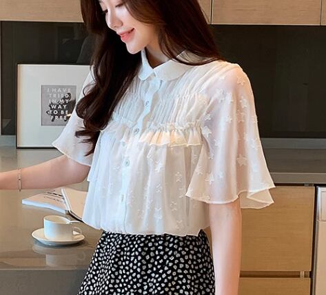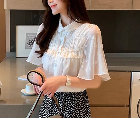 レディース トップス シャツ ミドル丈 半袖 襟付き 丸襟 ストレート フェミニン フリル 前開き ボタン ストレッチ 伸縮性 かわいい きれいめ シンプル カジュアル 上品 おしゃれ レトロ ガーリー ルーズ 個性的 存在感 ラブリー キュート ラグジュアリー クラシカル 清潔感 シック 高級感 芸術的 アーティスティック 華やか 優しい 穏やか フェアリー 星柄 夏 10代 20代 デート お出かけ 韓国 体型カバー 普段使い 着回し 清楚 S M L XL ゆったり ホワイト