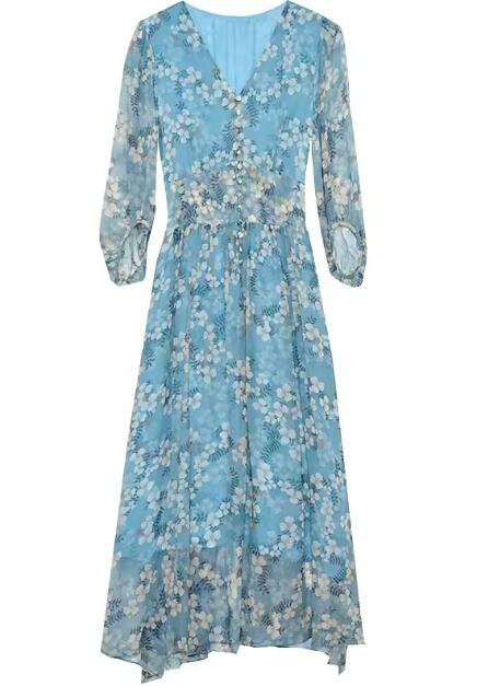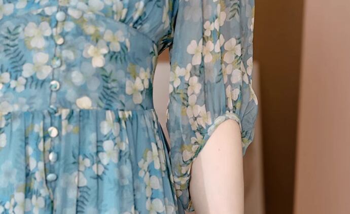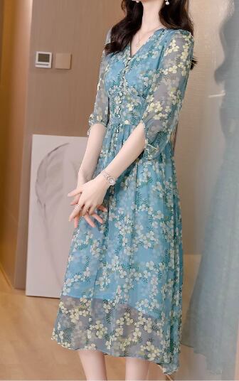 レディース ワンピース プルオーバー ミモレ ロング 半袖 5分袖 Vネック フェミニン ウエストマーク かわいい 大人可愛い きれいめ カジュアル 上品 おしゃれ ガーリー エレガント 存在感 キュート 清潔感 爽やか シック 高級感 華やか 優しい 穏やか 涼しげ 柔らかい 花柄 フラワー プリント 夏 デート お出かけ 普段使い 清楚 M L XL ブルー