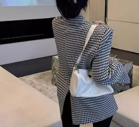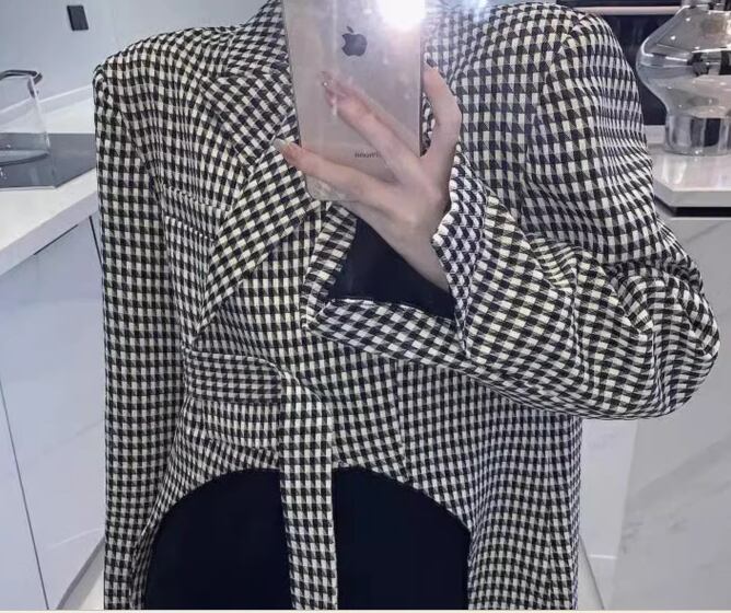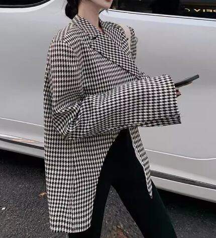 ブラック×ホワイトのモノトーンカラーとレトロな千鳥格子柄が大人可愛い、ミドル丈の長袖ジャケット。
