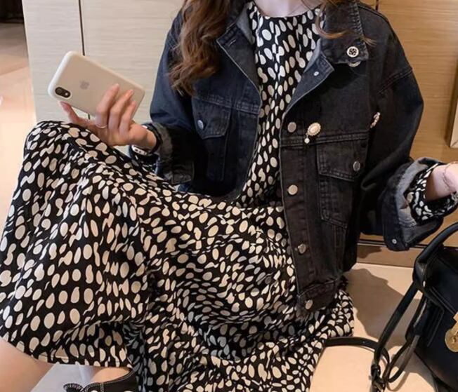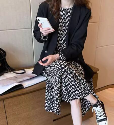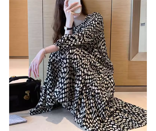 モノトーンカラーの水玉模様が大人可愛い、レトロな雰囲気のシフォンワンピース。