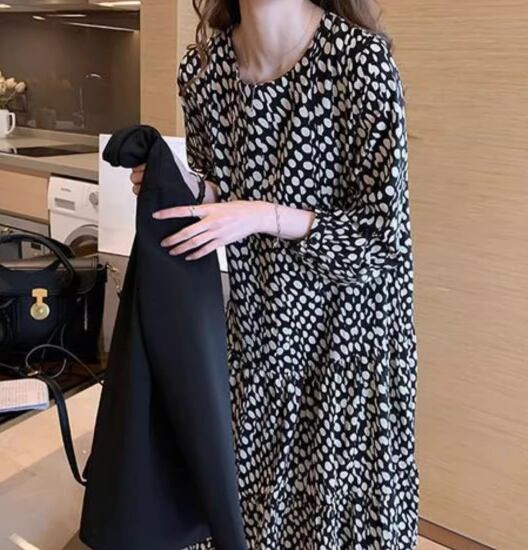 レディース ワンピース プルオーバー ミモレ ロング 長袖 ラウンドネック ティアード シフォン ハイウエスト かわいい 大人可愛い きれいめ カジュアル 上品 おしゃれ レトロ ラフ ガーリー ルーズ 存在感 キュート リラックス シック 優しい 穏やか 水玉 プリント 春 デート お出かけ モノトーン 体型カバー 普段使い 清楚 L XL 大きいサイズ ゆったり ゆる 大きめ オーバーサイズ ブラック