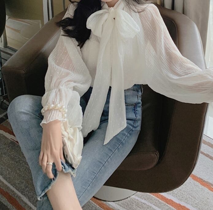 フェミニンなリボンタイとふわふわシフォンのブラウスです。