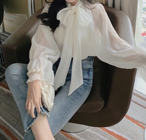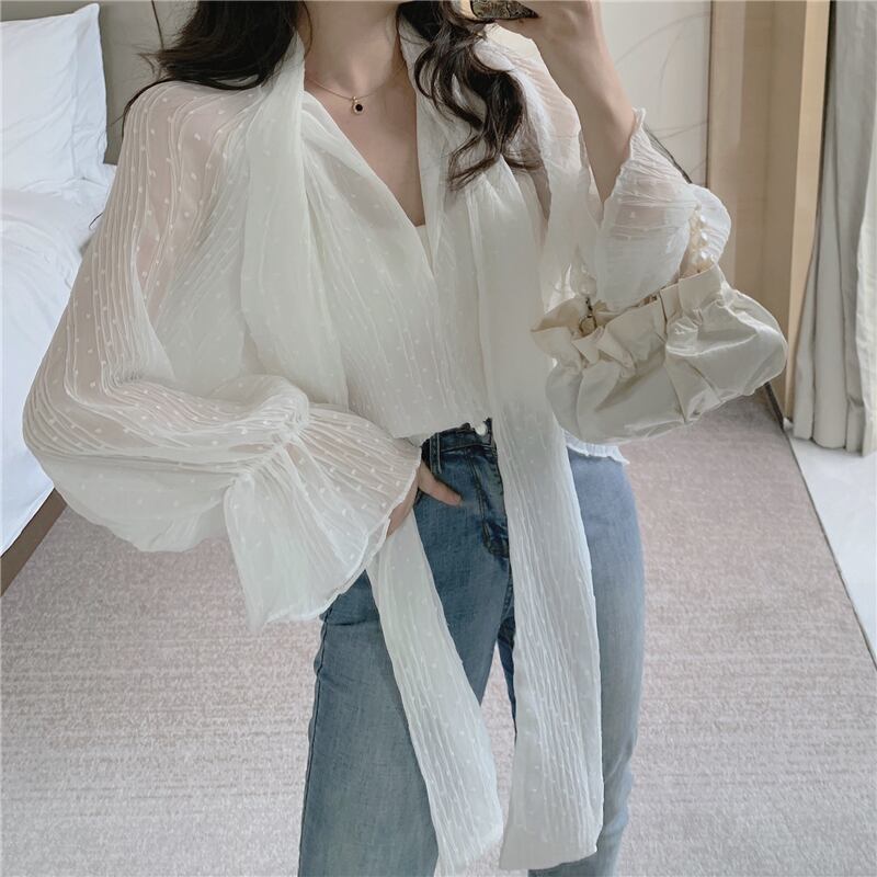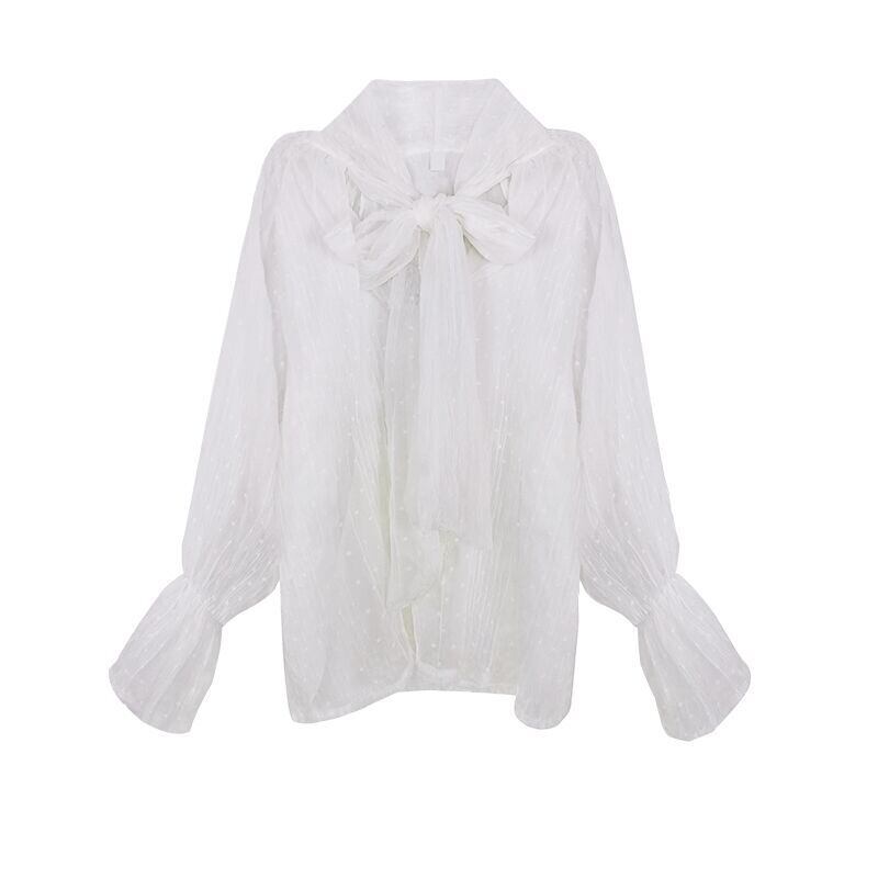 レディース トップス シャツ ブラウス 長袖 萌袖 ベルスリーブ Vネック りぼんタイ フェミニン レース シフォン リボン ふわふわ ふっくら 透け感 シースルー 肌見せ 通気性 薄手 かわいい 大人可愛い 上品 ガーリー 個性的 主役級 存在感 とろみ感 抜け感 ラブリー キュート セクシー 華やか 柔らかい ドット柄 ストライプ 春 お出かけ 女子会 モテ フリーサイズ ホワイト アプリコット