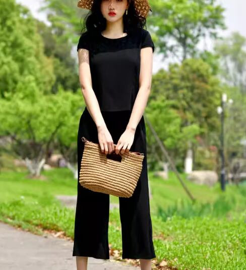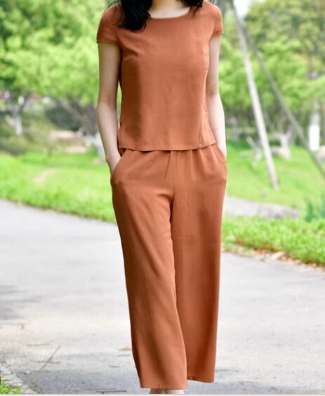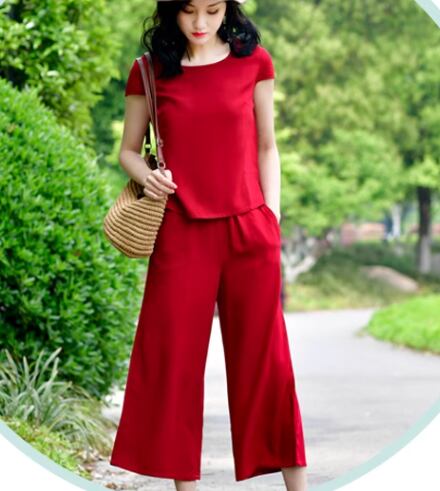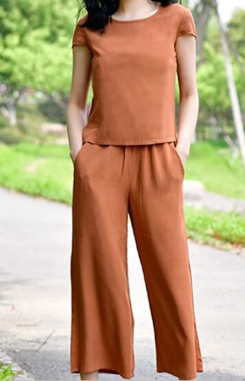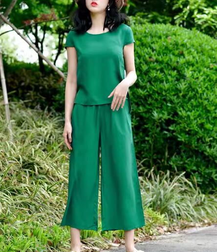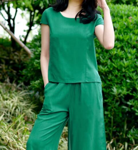 二点セット 上下セット ツーピース レディース トップス パンツ カットソー プルオーバー セットアップ ワイドパンツ Tシャツ クロップド丈 半袖 ラウンドネック ポケット ウエストゴム 綿 大人可愛い きれいめ シンプル カジュアル 上品 レトロ ラフ ボーイッシュ クール ナチュラル リラックス ハンサム シック 高級感 涼しげ 無地 夏 お出かけ 楽ちん 普段使い 着回し M L XL ブラック ブラウン レッド グリーン