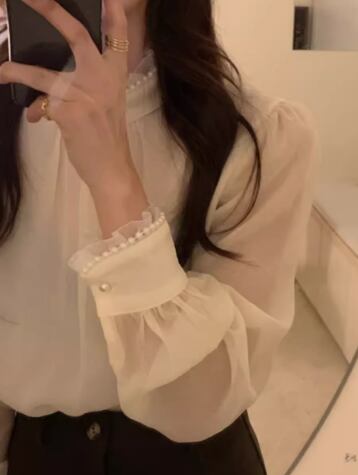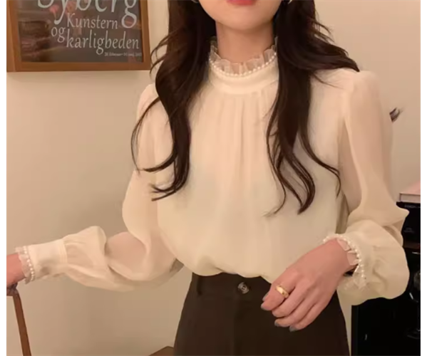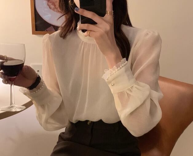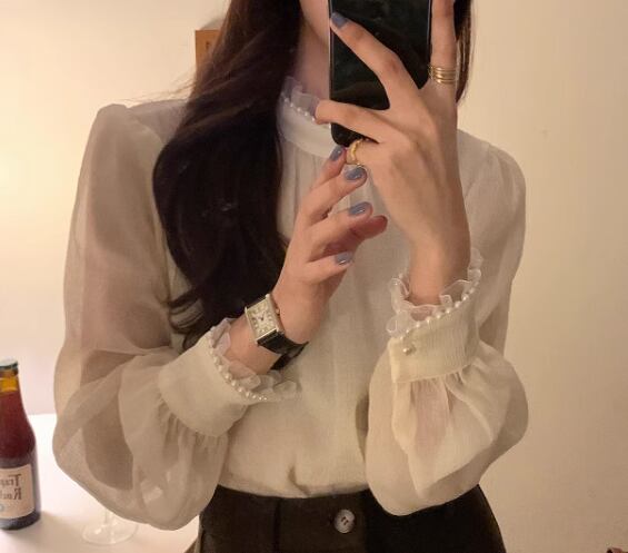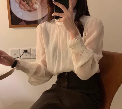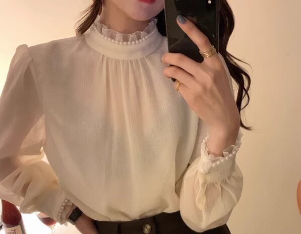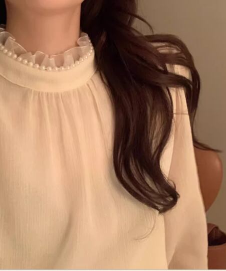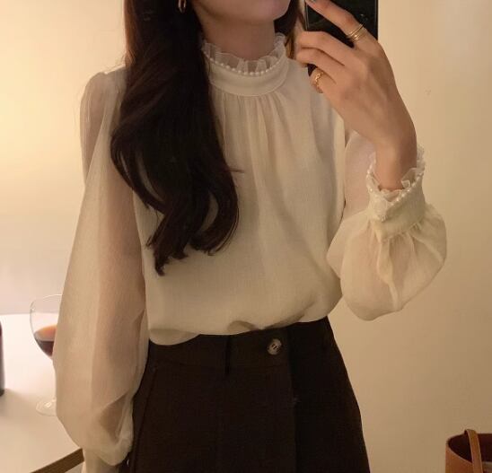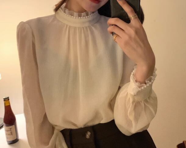 レディース トップス シャツ ブラウス プルオーバー ミドル丈 長袖 ハイネック スタンドカラー ストレート フェミニン レース シフォン フリル 透け感 パール かわいい 大人可愛い きれいめ シンプル 上品 おしゃれ レトロ ガーリー エレガント キュート ラグジュアリー シック 高級感 優しい 穏やか フェアリー 柔らかい 無地 秋 デート お出かけ 普段使い 着回し モテ 清楚 S M L XL ゆったり アプリコット