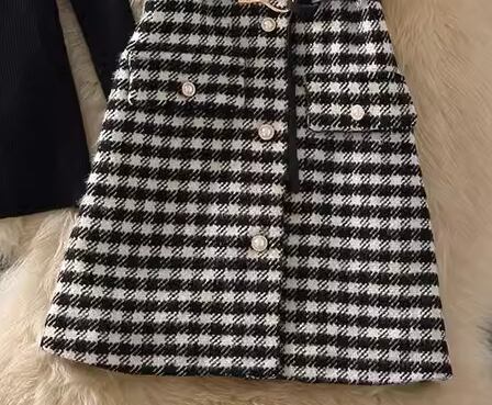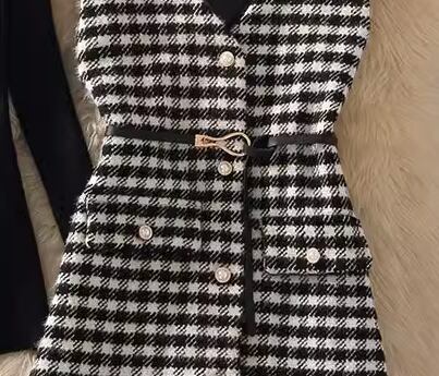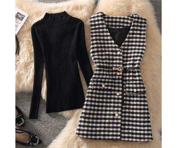 シンプルな黒のニットセーターとレトロな千鳥格子柄が魅力的なノースリーブベストの2点セット。